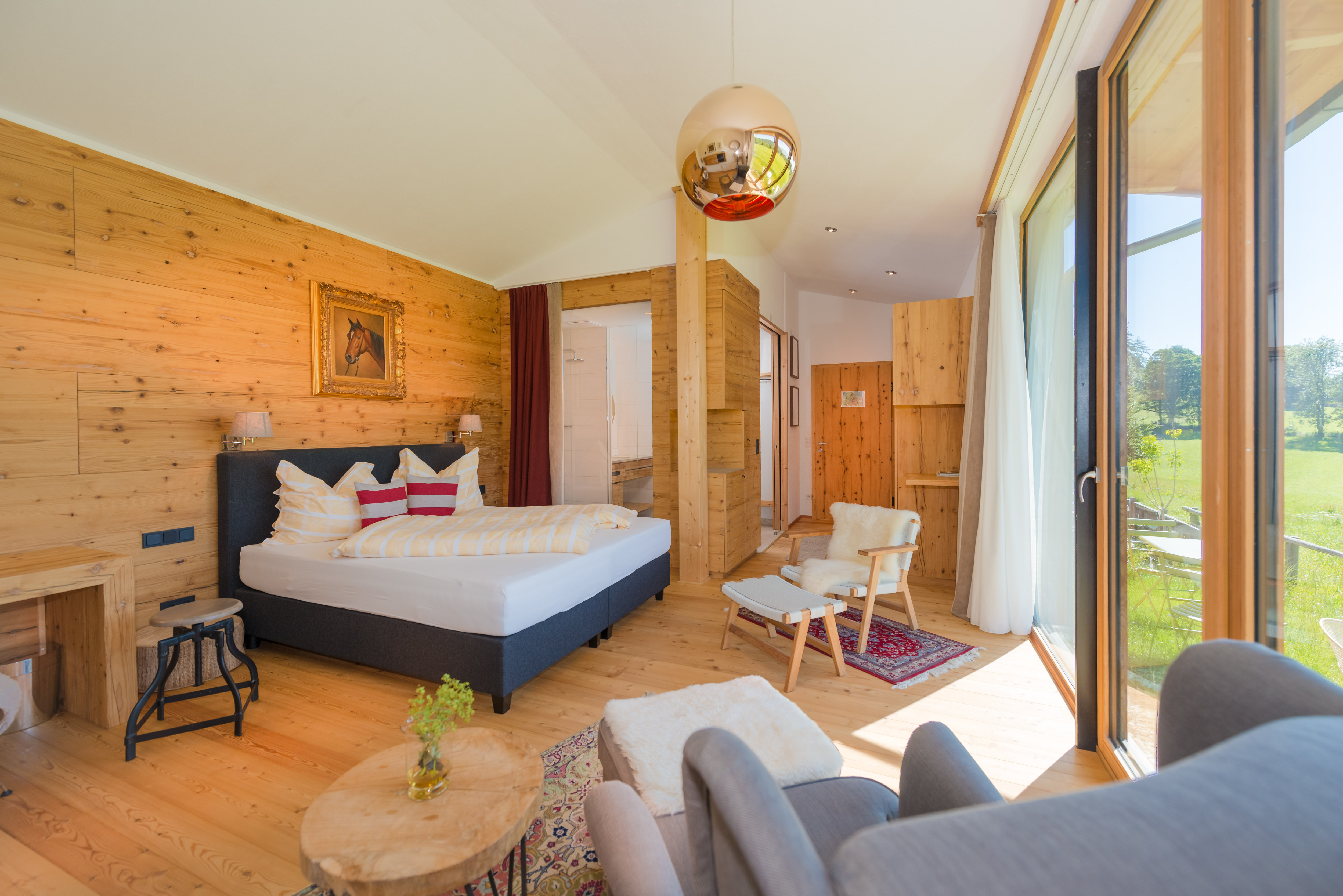 Modern ohne kühl zu sein - eine große Glasfront und der Blick in die Berge – direkt vom Bett aus! Alt und traditionell - die dazugehörige Wohnküche ist im alten Teil des Zuhäusl’s,